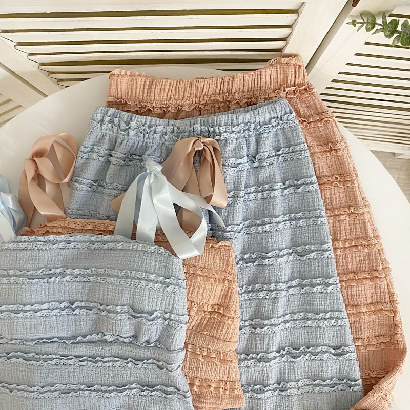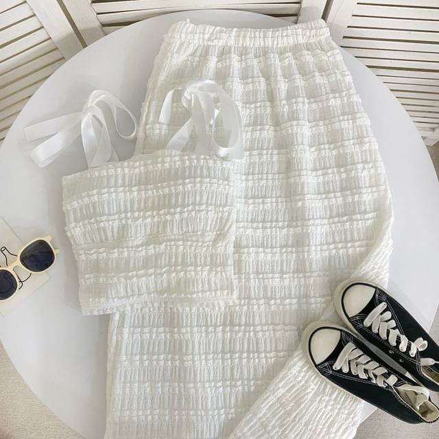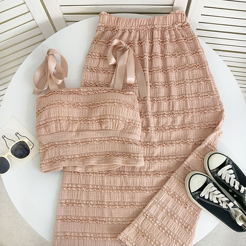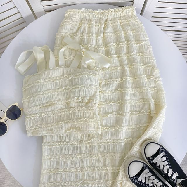 Set: Tie Shoulder Plain Frill Camisole Top + Elastic Waist Maxi A-Line Skirt