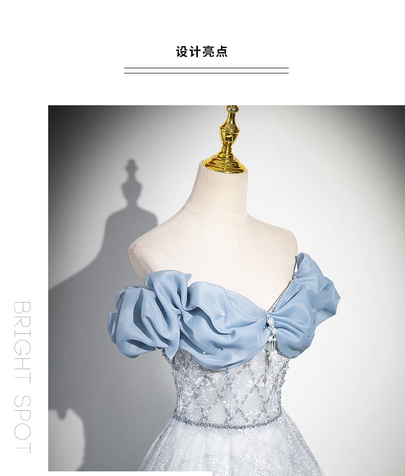 Short-Sleeve Off Shoulder Beaded Ruched Mesh A-Line Evening Gown