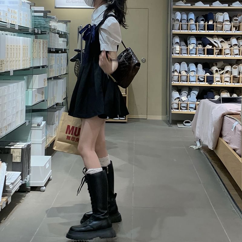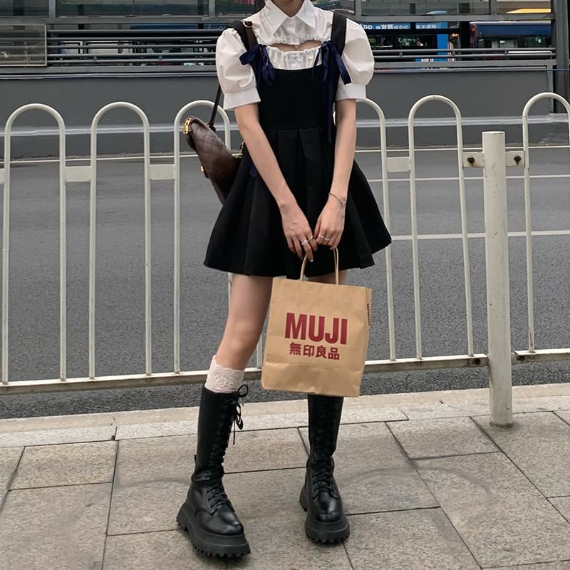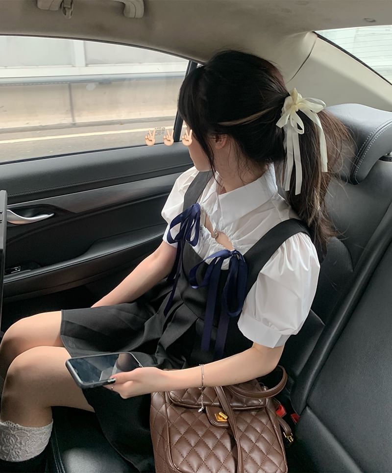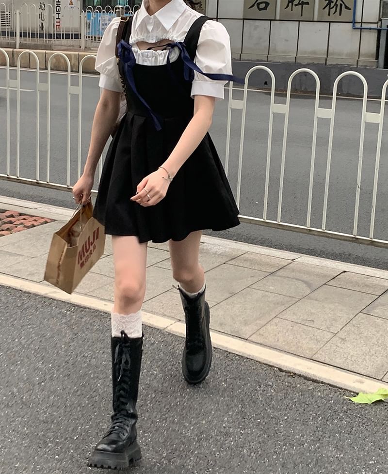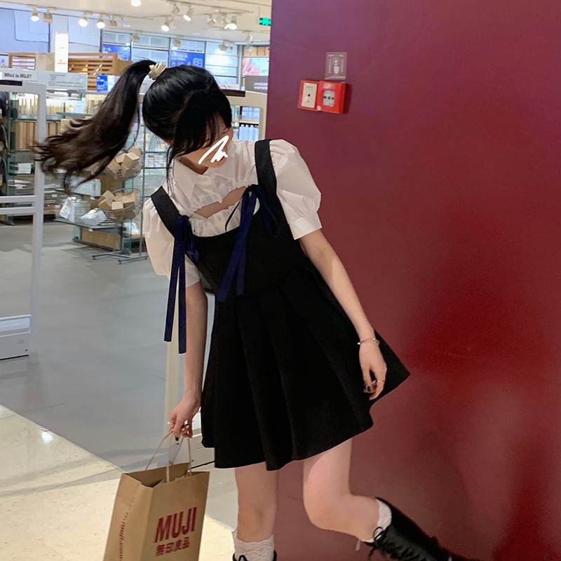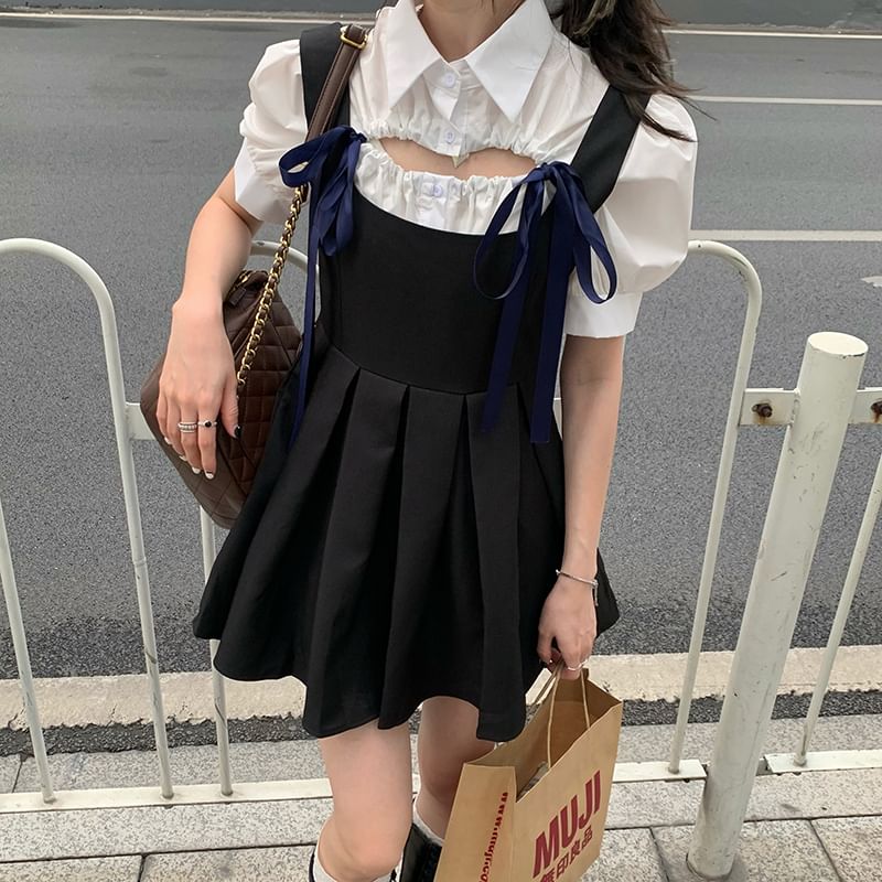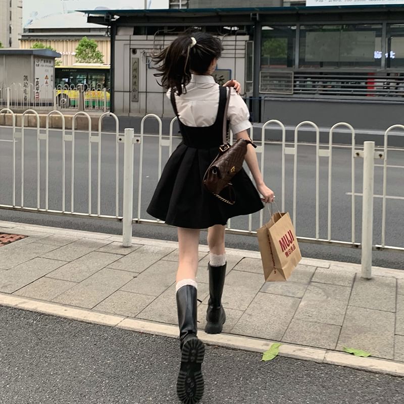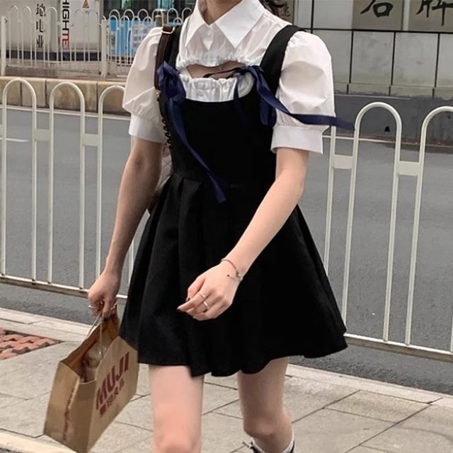 Short-Sleeve Plain Blouse / Sleeveless Velvet Mini A-Line Dress
