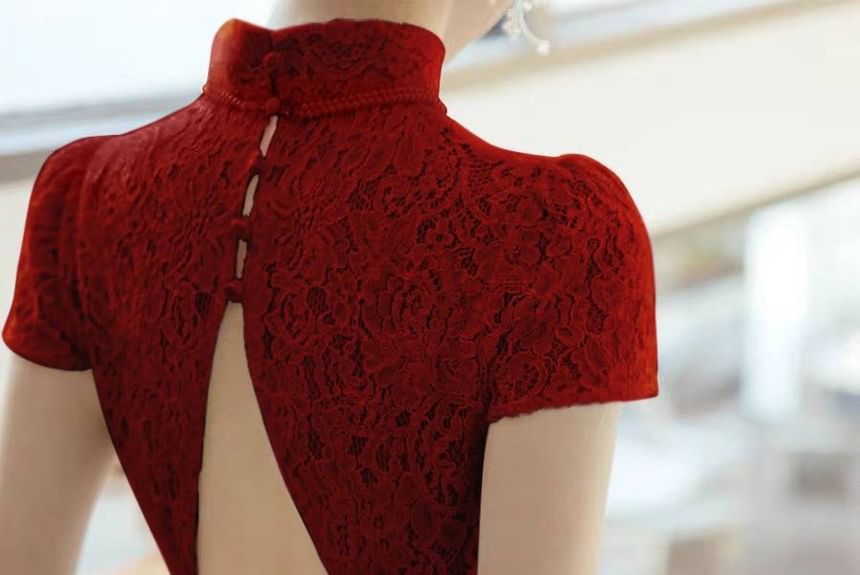 Short-Sleeve Plain Lace Sheath Wedding Gown
