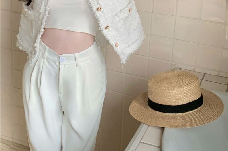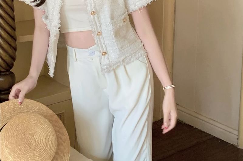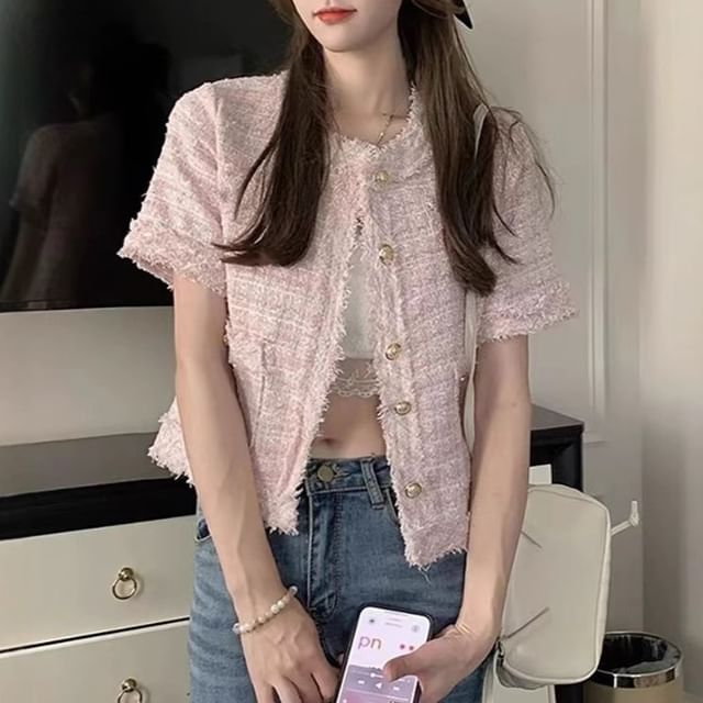 Short Sleeve Round Neck Fray Tweed Button Jacket