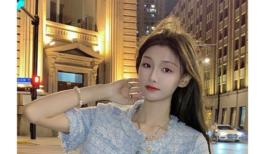 Short-Sleeve Crew Neck Tweed Button Jacket