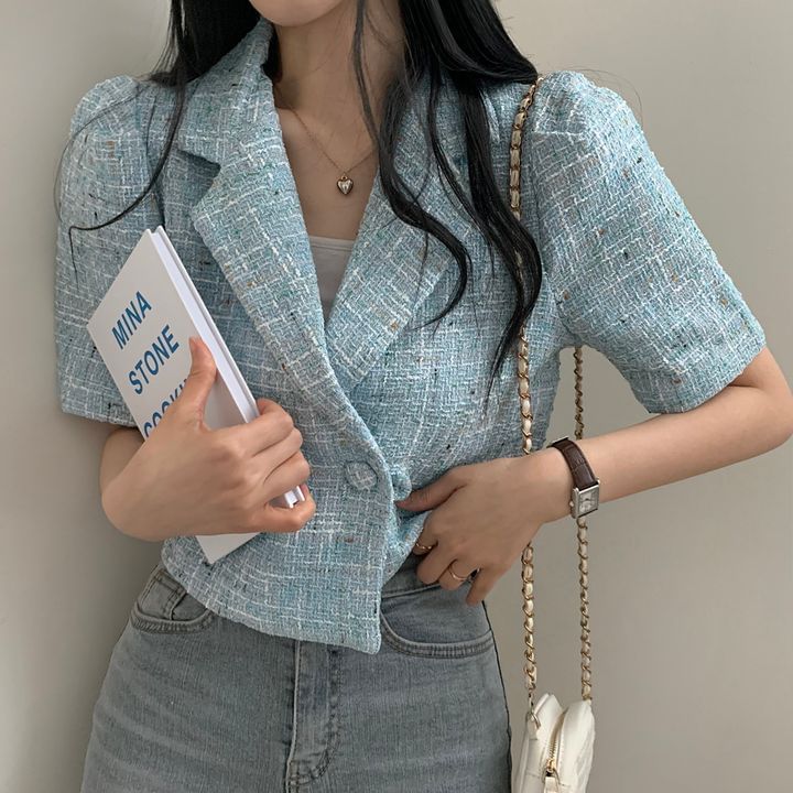 Short-Sleeve Double Breasted Tweed Crop Blazer