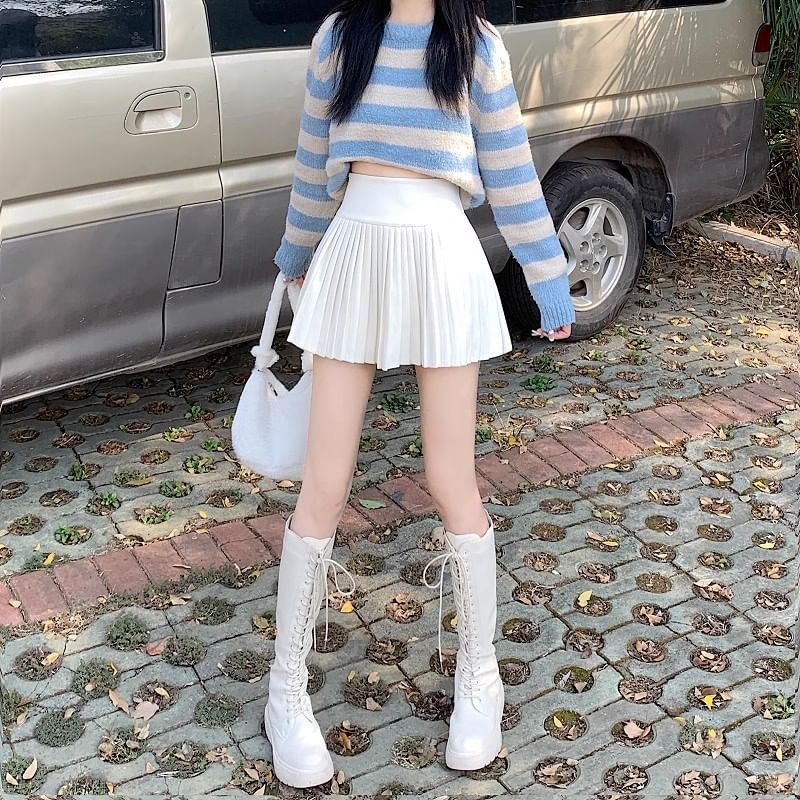 High Waist Plain Accordion Pleated Mini A-Line Skirt