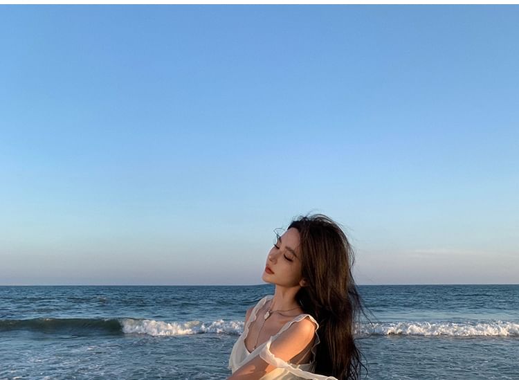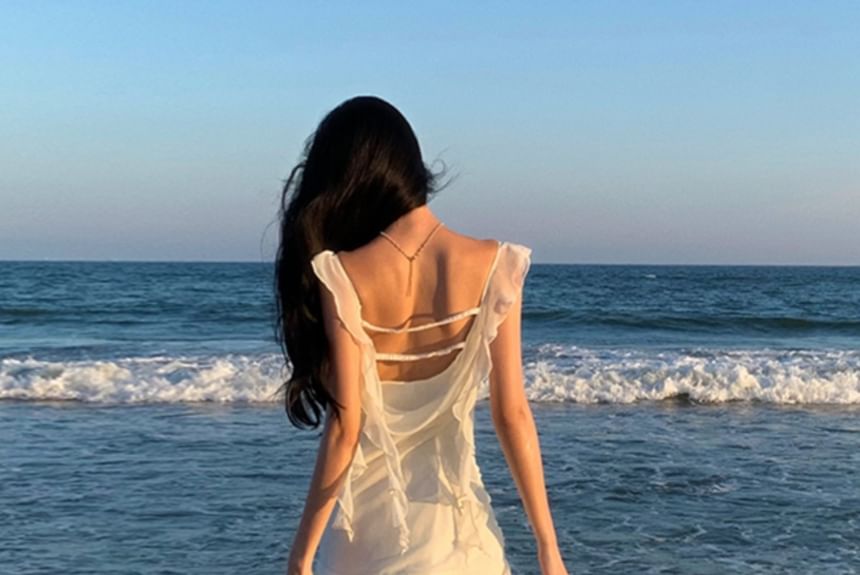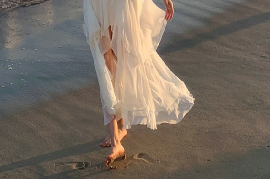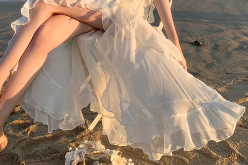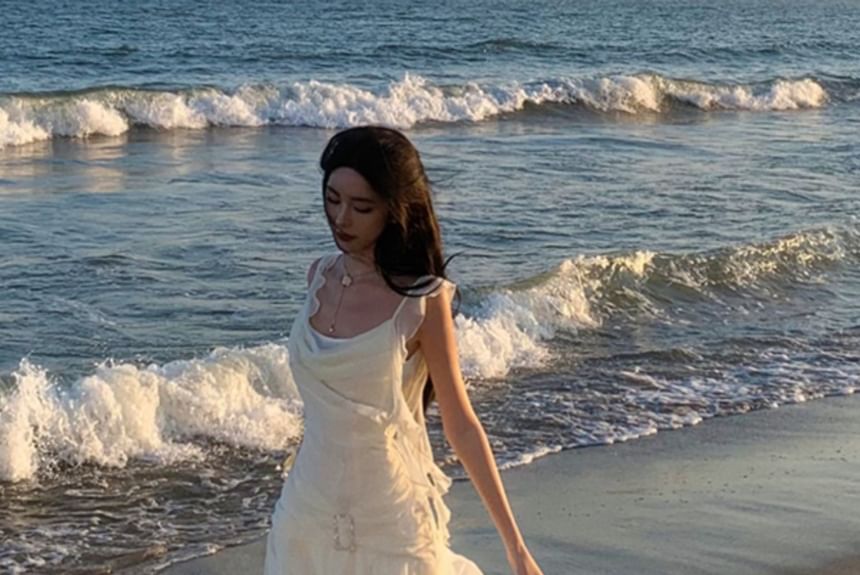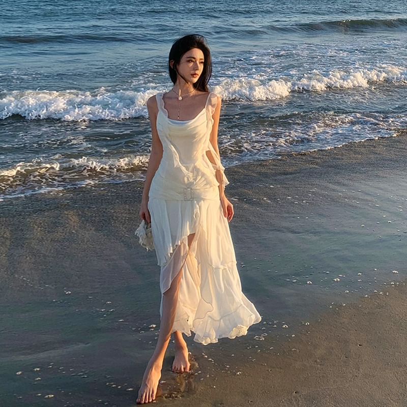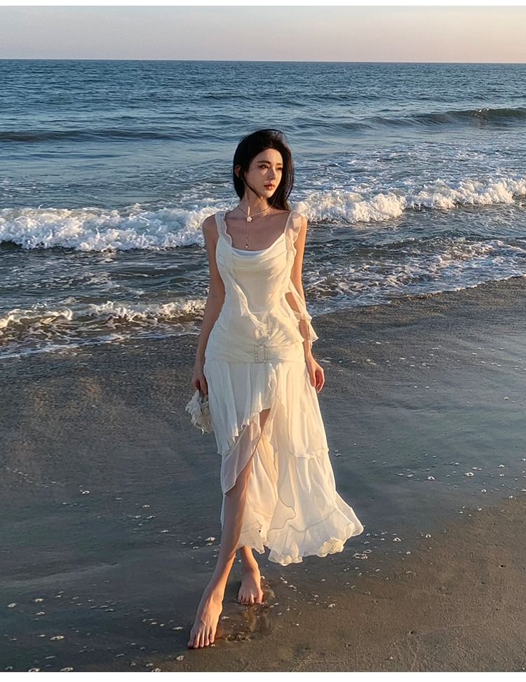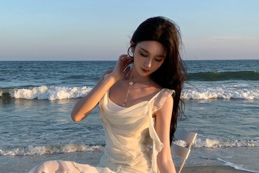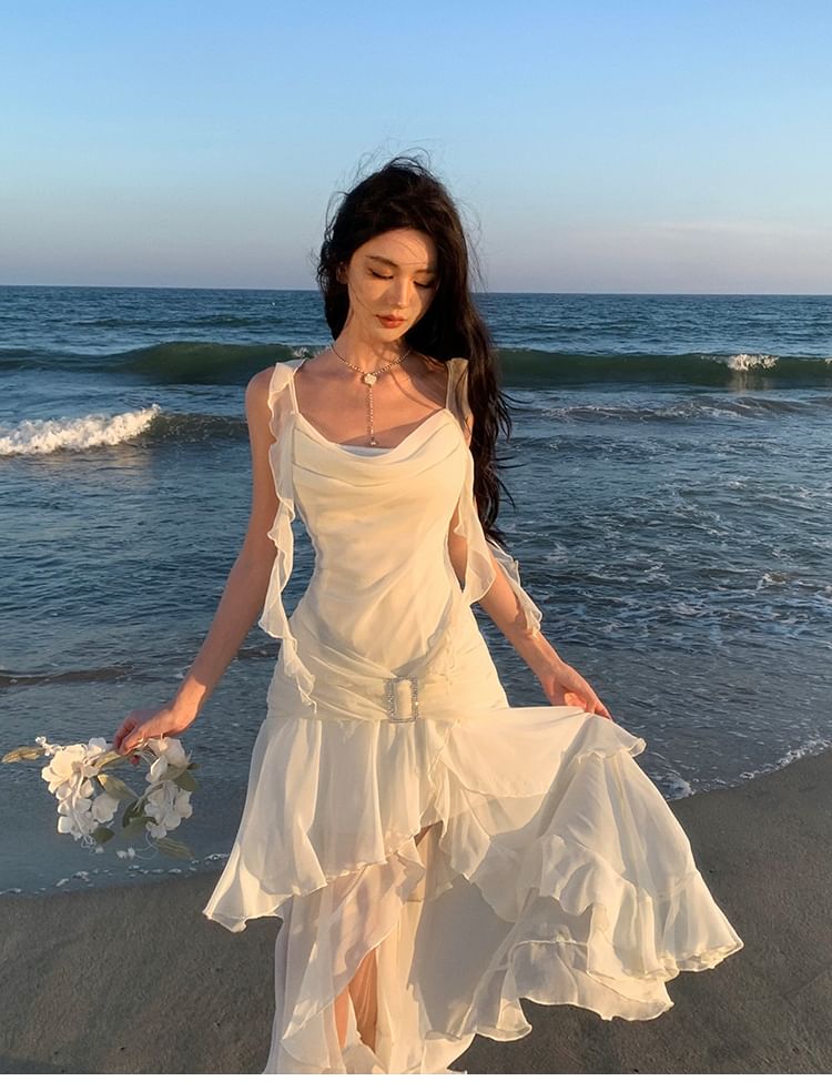 Sleeveless Cowl Neck Plain Ruffle Buckled Asymmetrical Maxi A-Line Dress