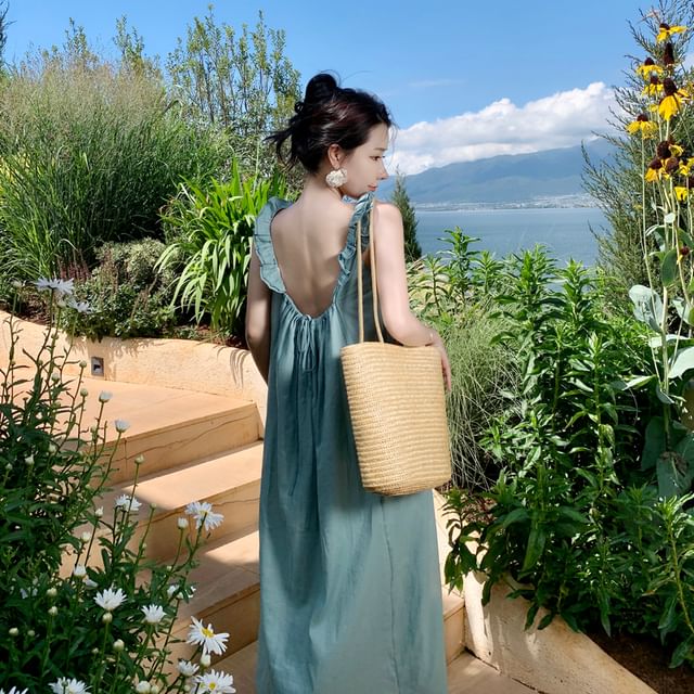 Sleeveless Crew Neck Plain Frill Trim Open Back Maxi Tunic Dress