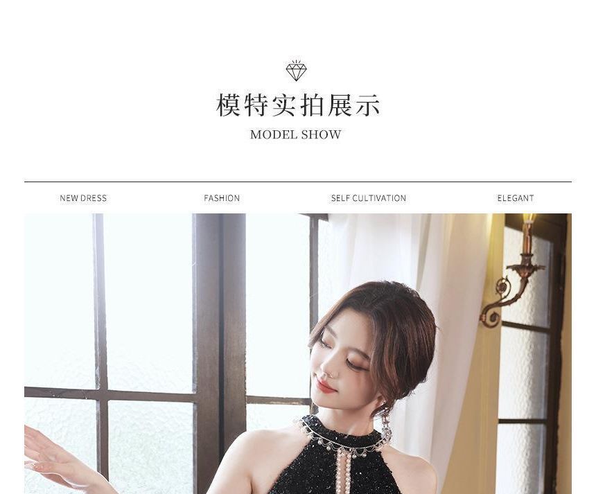 Sleeveless Crew Neck Sequin Faux Pearl Keyhole Ruffle Panel Mesh High-Low A-Line Evening Gown
