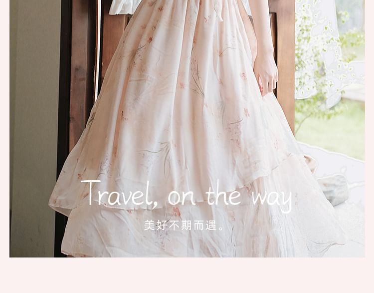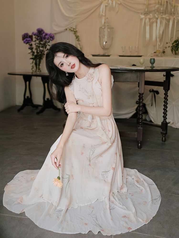 Sleeveless Mock Neck Floral Ruffle Trim Midi A