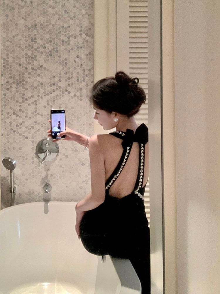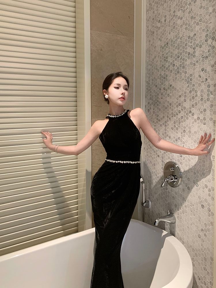 Sleeveless Plain Rhinestone Accent Mermaid Evening Gown