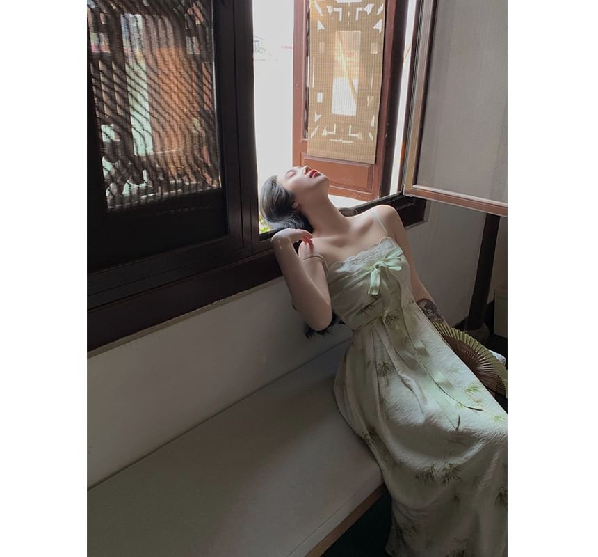 Spaghetti Strap Bamboo Print Midi A-Line Dress / Light Jacket / Set