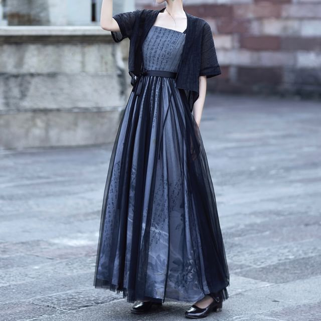 Spaghetti Strap Chinese Character Print Panel Mesh Maxi A-Line Dress / Short-Sleeve Plain Tie Front Jacket