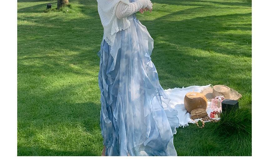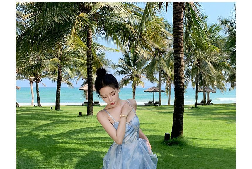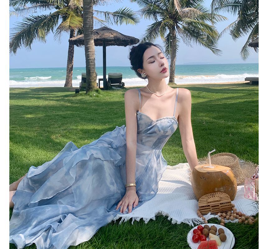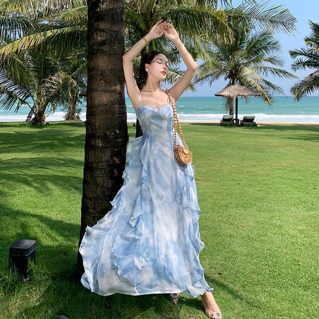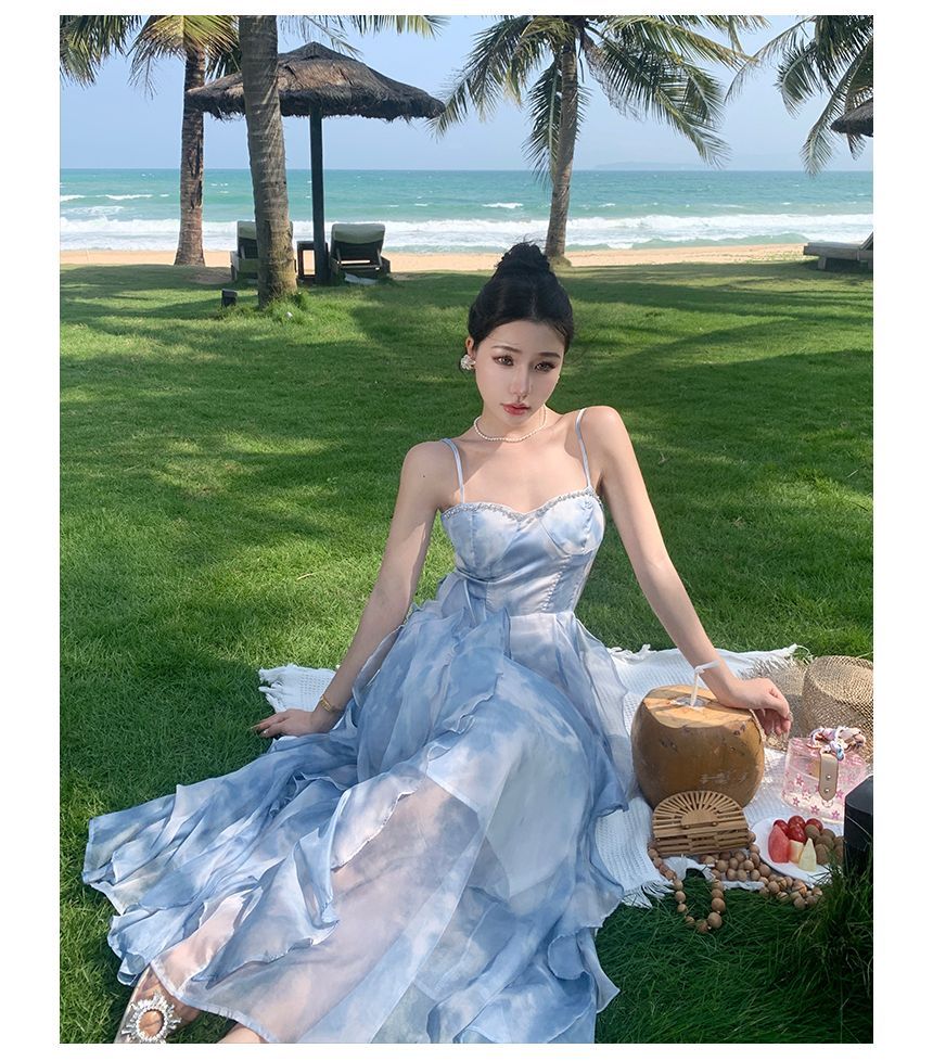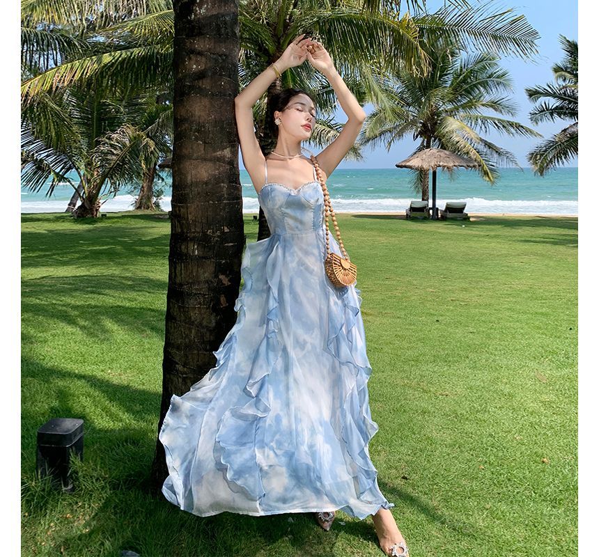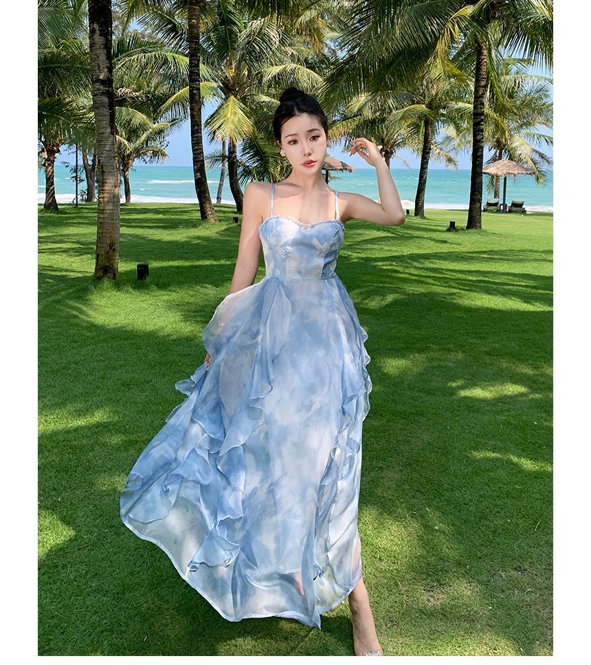 Spaghetti Strap Floral Print Asymmetrical Ruffle Midi Sundress