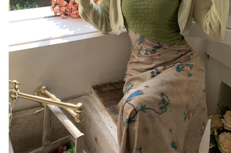 Spaghetti Strap Floral Print Panel Midi A-Line Dress / Crop Light Jacket / Set