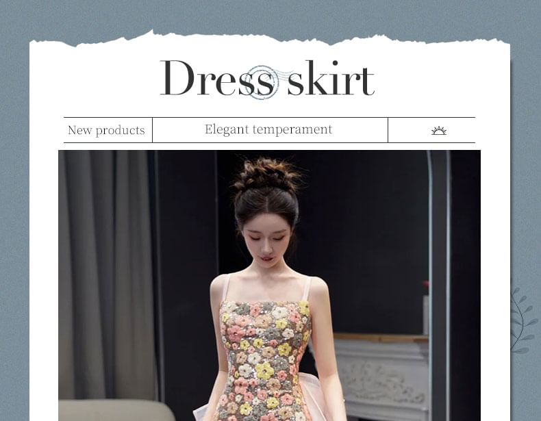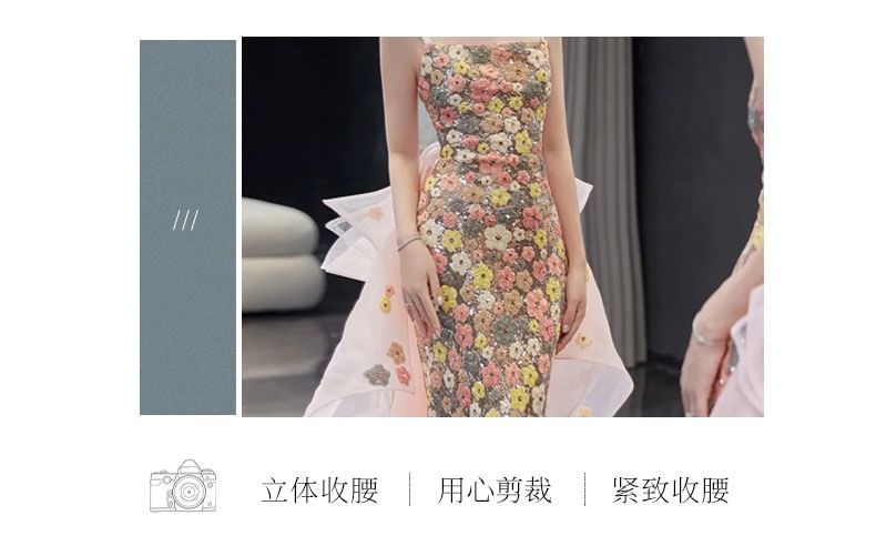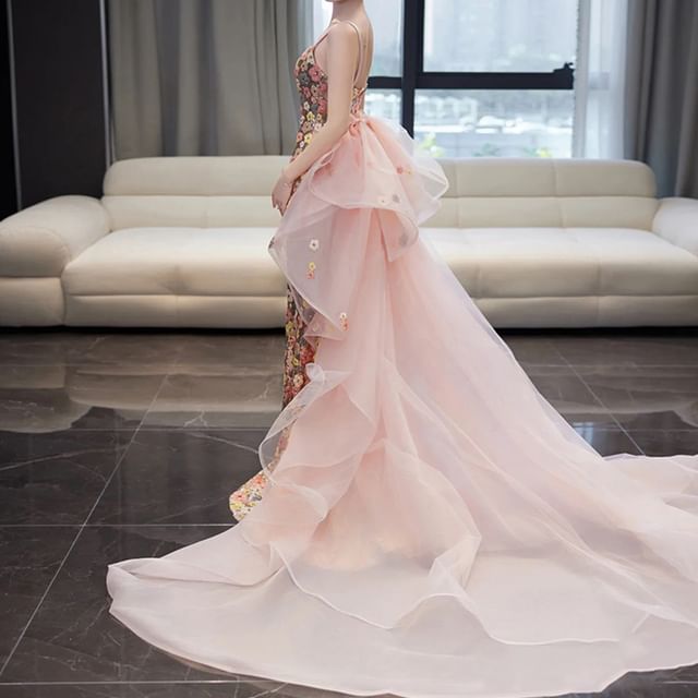Spaghetti Strap Floral Sequin Bow Back Trained Mermaid Evening Gown