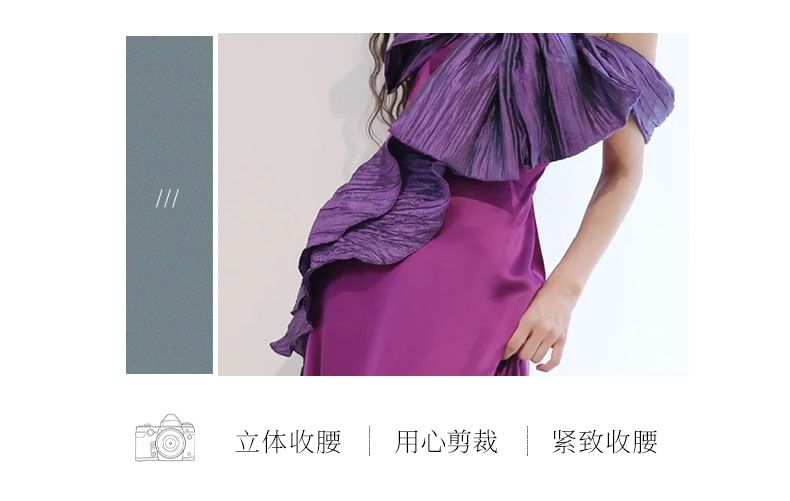 Spaghetti Strap One-Shoulder Two Tone Bow Accent Ruffle Trim A-Line Satin Evening Gown