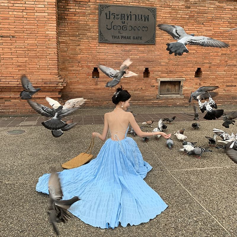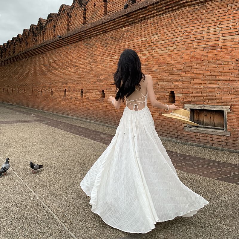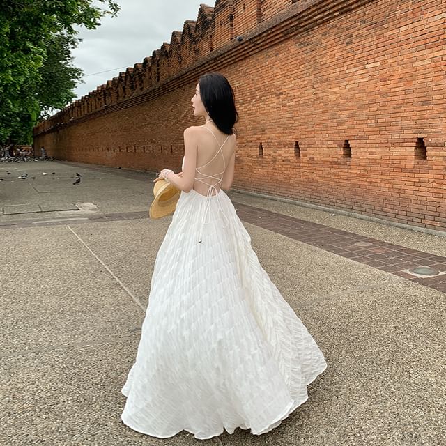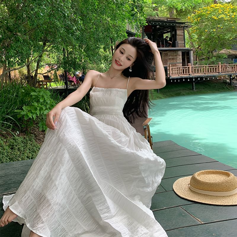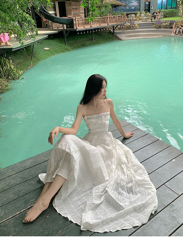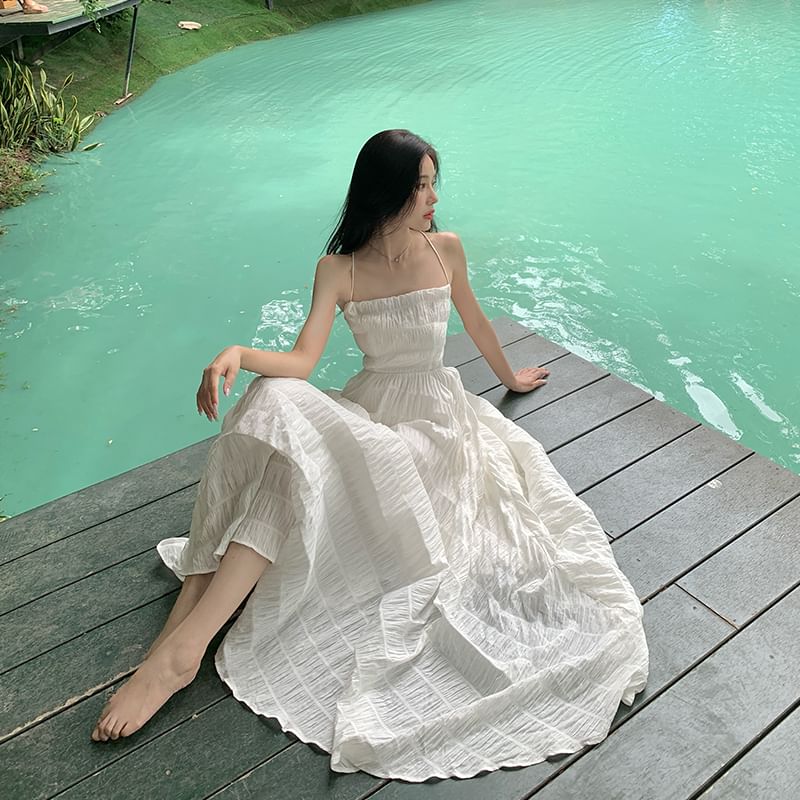 Spaghetti Strap Plain Cross Back Shirred Midi Sundress