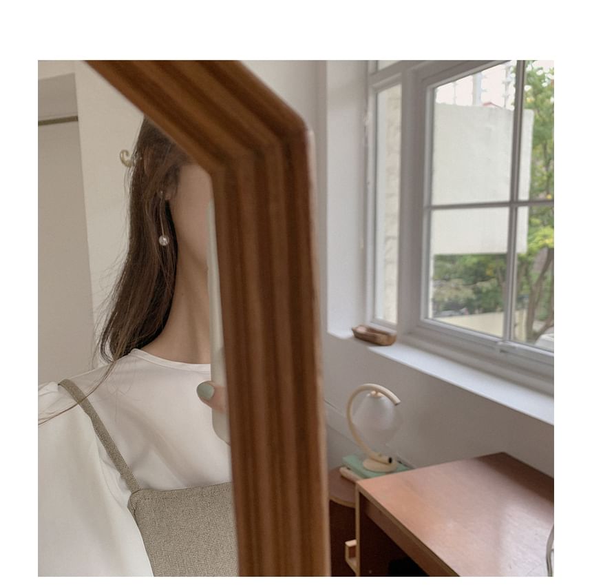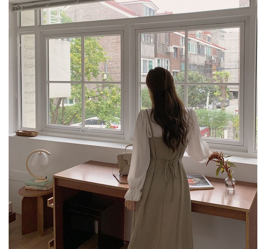 Spaghetti Strap Plain Midi Overall Dress / Long-Sleeve Crew Neck Plain Ruffle Trim Blouse