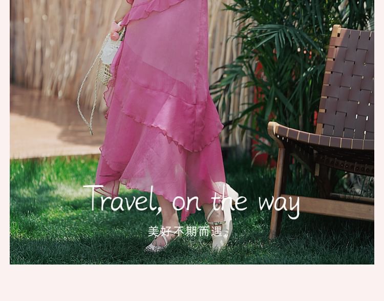 Spaghetti Strap Plain Ruffle Trim Midi Sheath Dress / Flower Hair Clip / Set