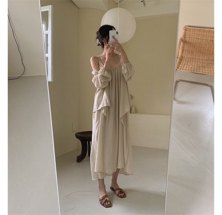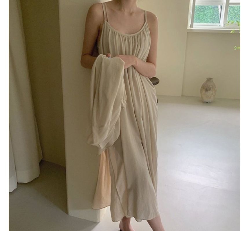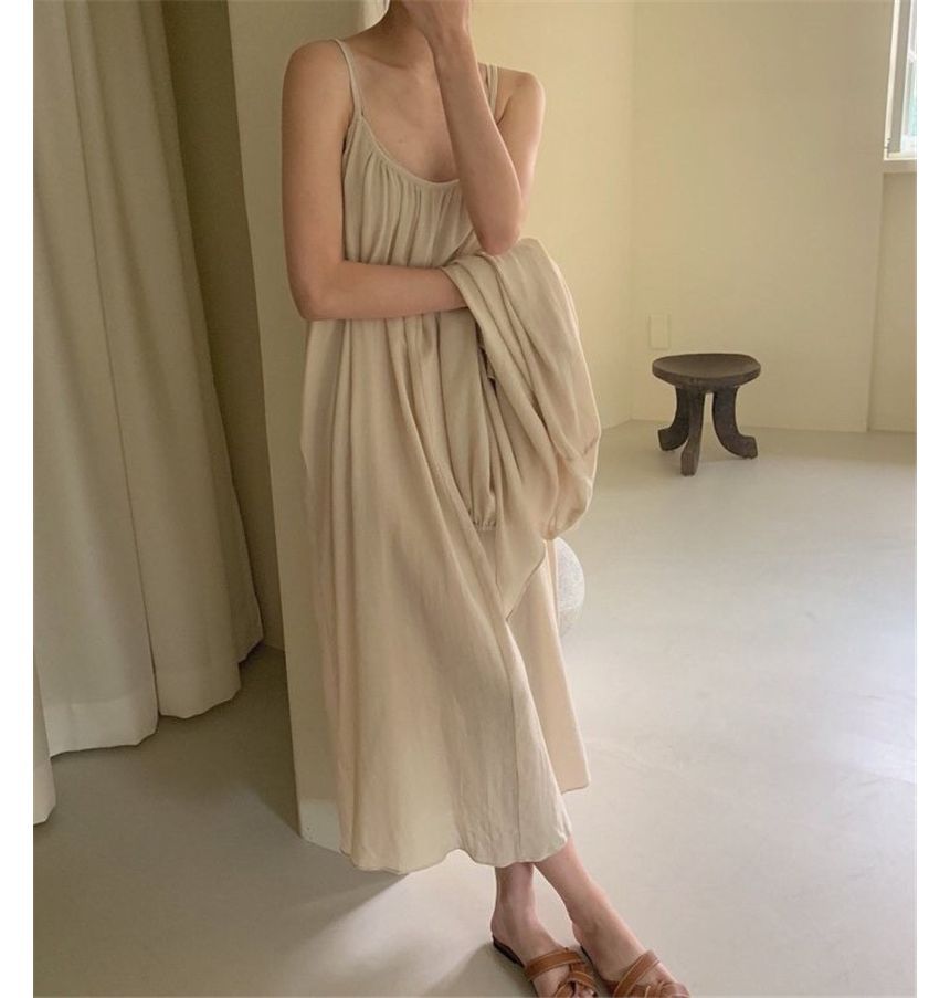 Spaghetti Strap Plain Shirred Midi A-Line Dress / Puff-Sleeve Open Front Jacket