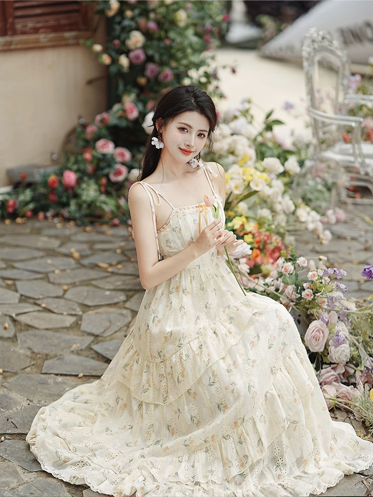 Spaghetti Strap Print Midi Tiered Dress / Plain Cardigan / Set