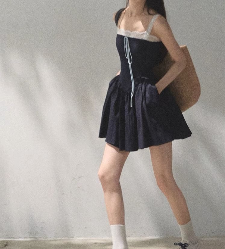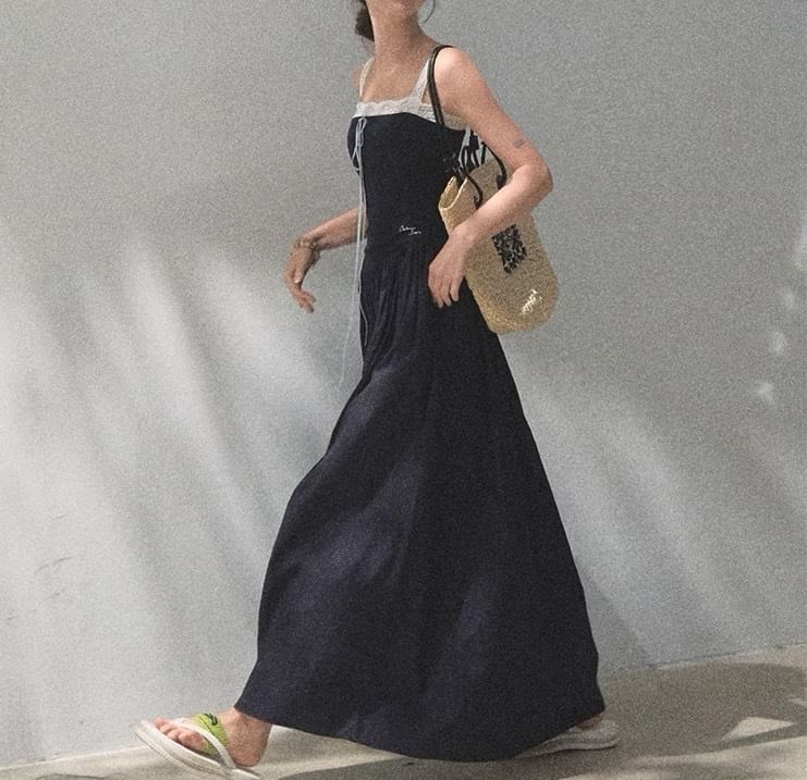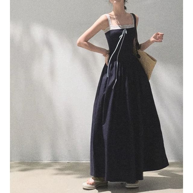 Spaghetti Strap Square Neck Plain Lace Trim A-Line Dress (Various Designs)