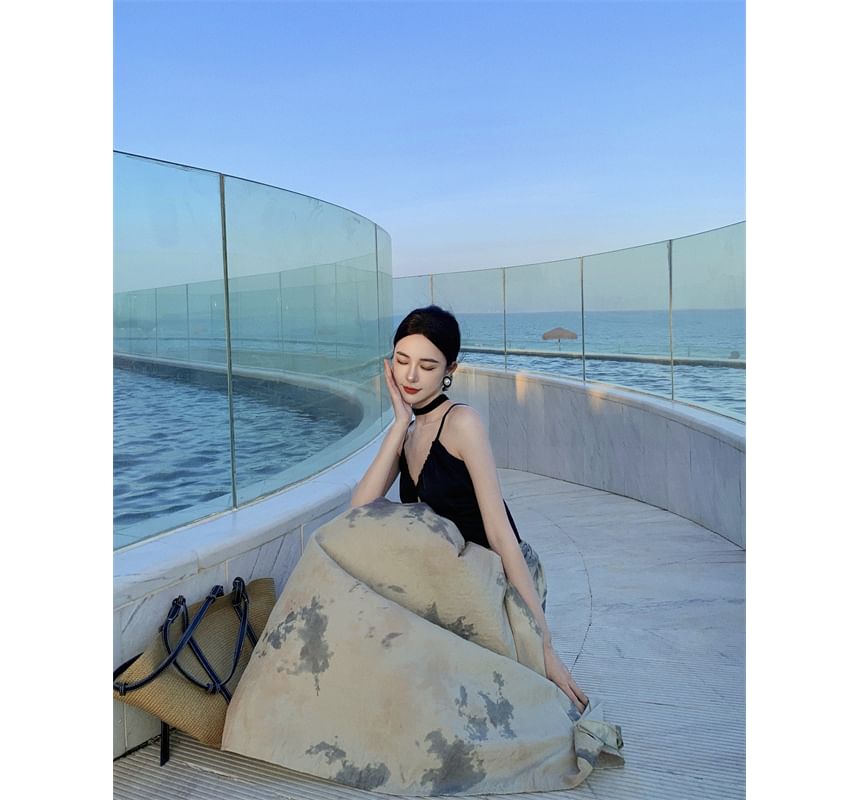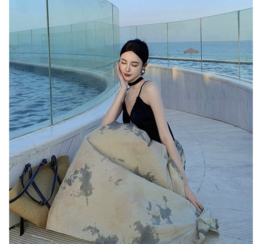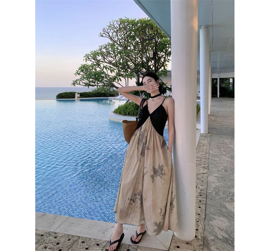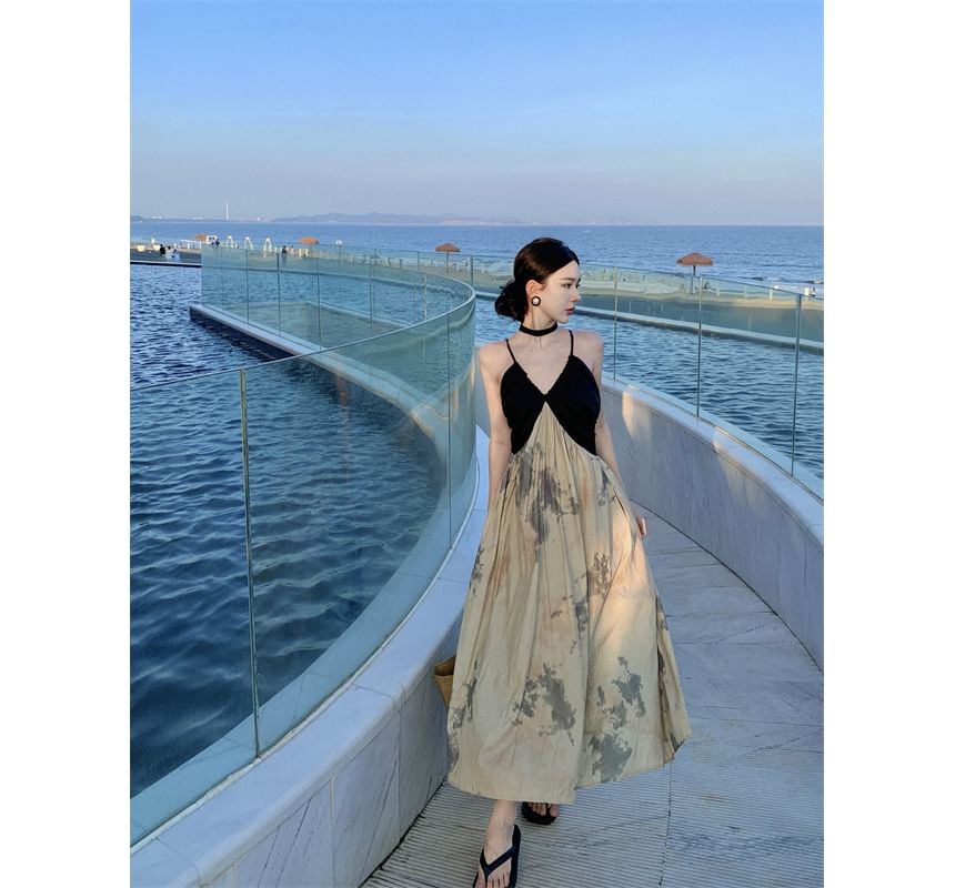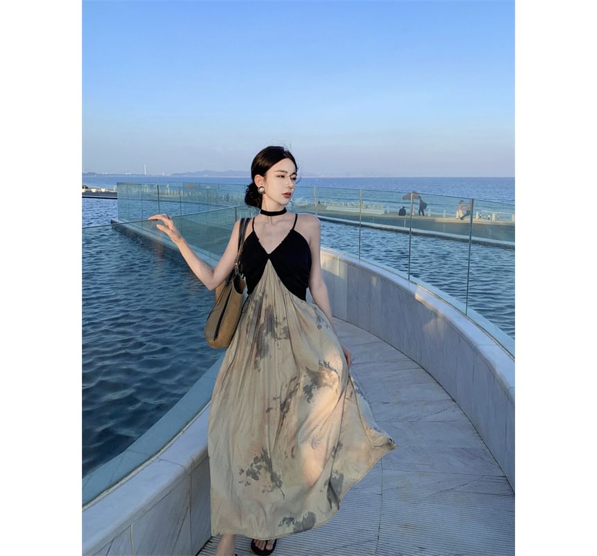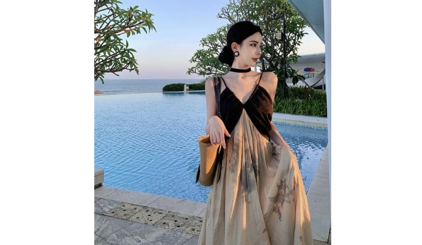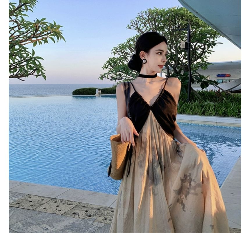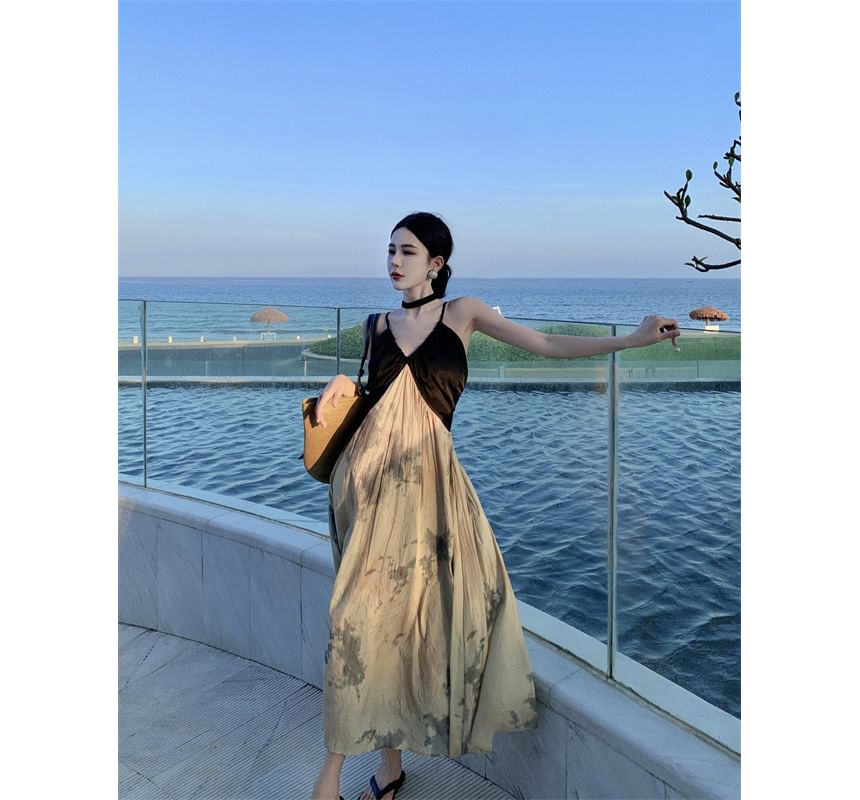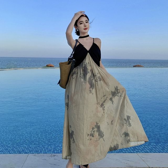 Spaghetti Strap V-Neck Printed Paneled Midi A-Line Dress
