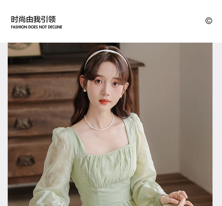 Square Neck Long Sleeve Embroidered Midi A-Line Dress