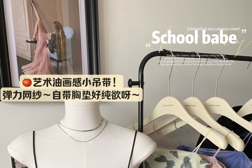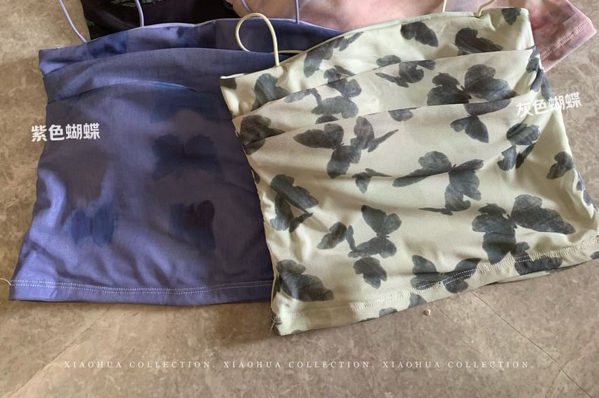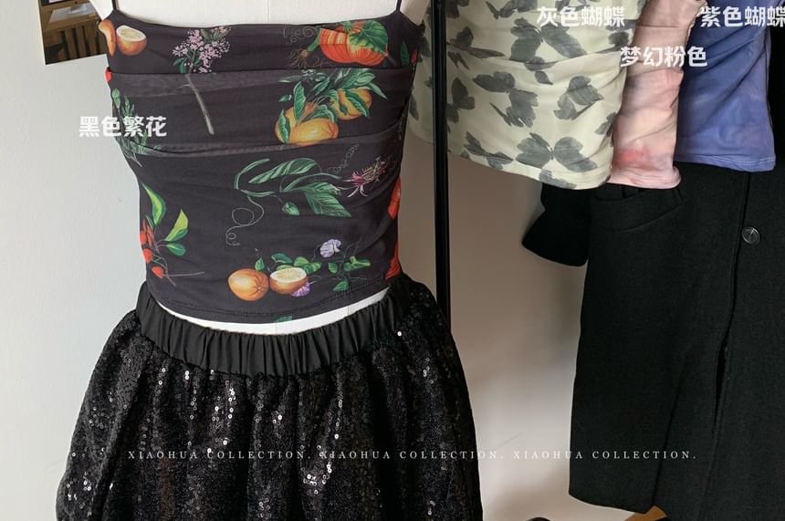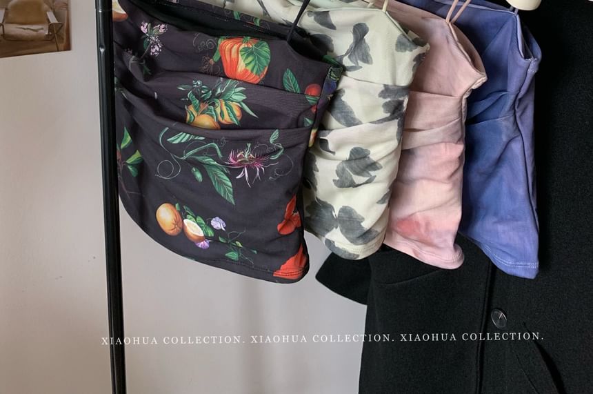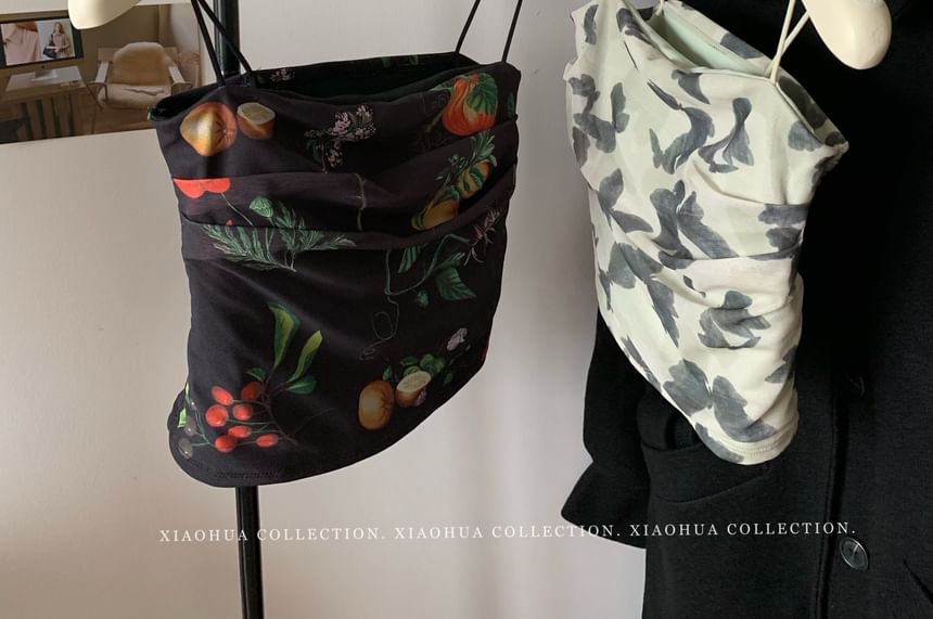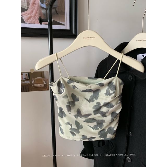 Square Neck Print Padded Ruched Mesh Crop Camisole Top