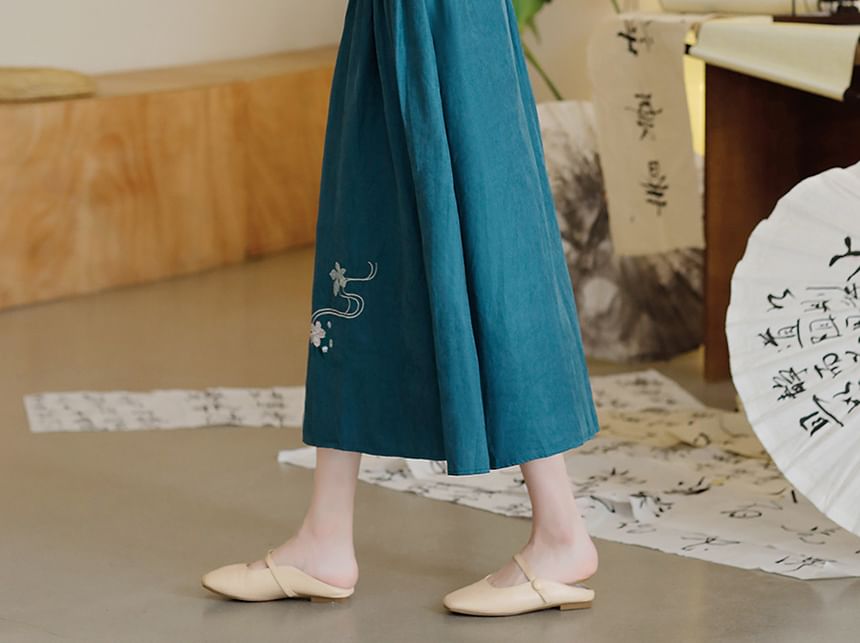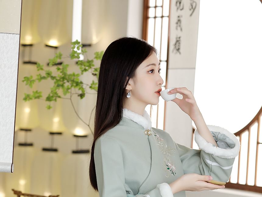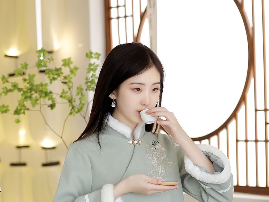 Stand Collar Floral Embroidered Fluffy Trim Tie Front Jacket / High Waist Midi A