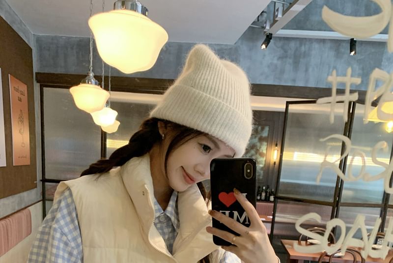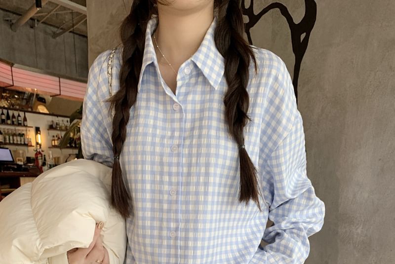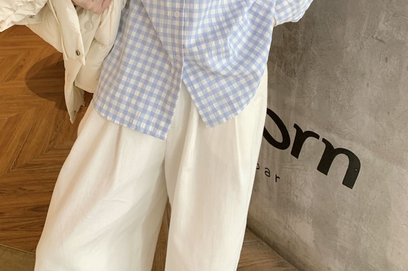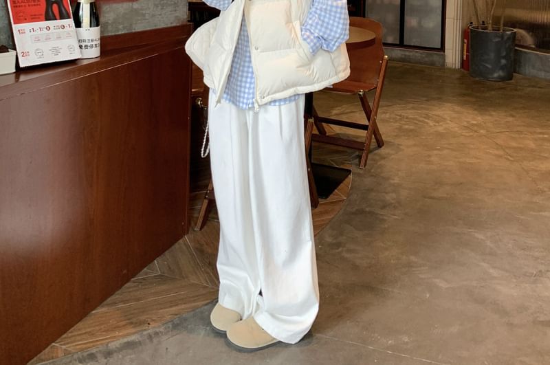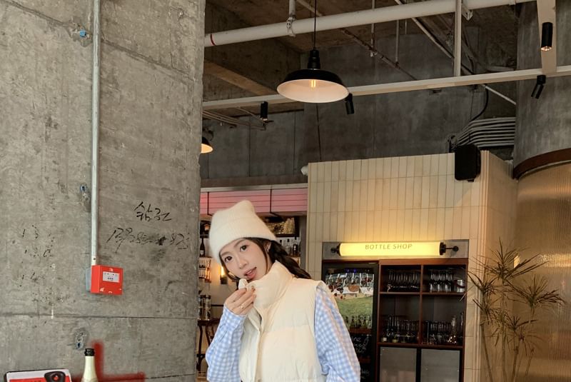 Stand Collar Plain Zip Puffer Vest / Long Sleeve Collared Plaid Shirt