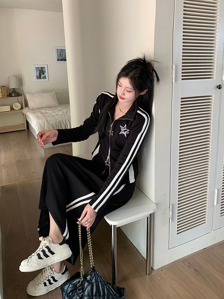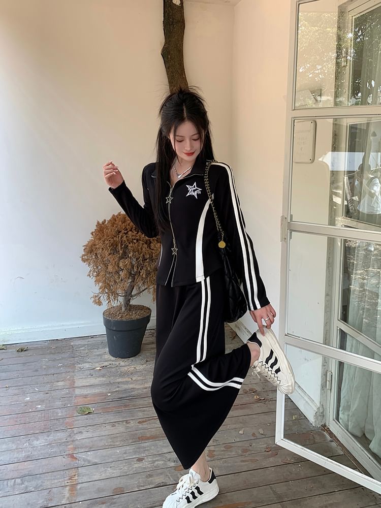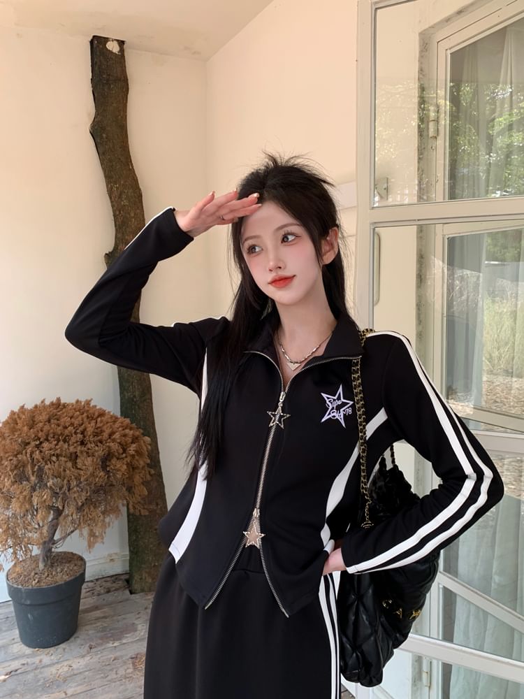 Stand Collar Striped Zip Jacket / Mid Rise Striped Midi A-Line Skirt