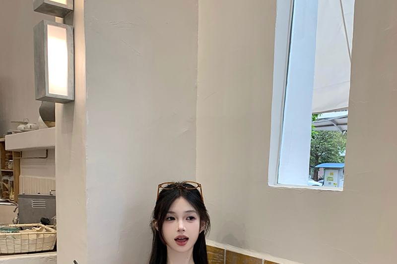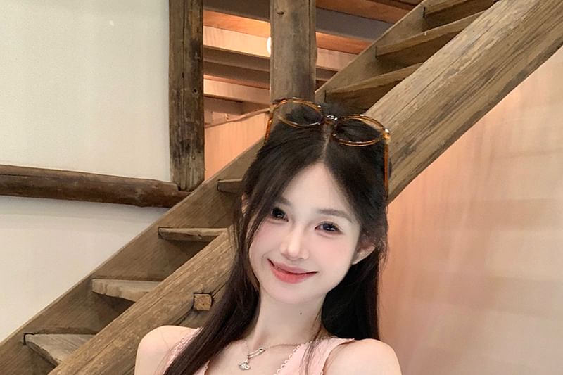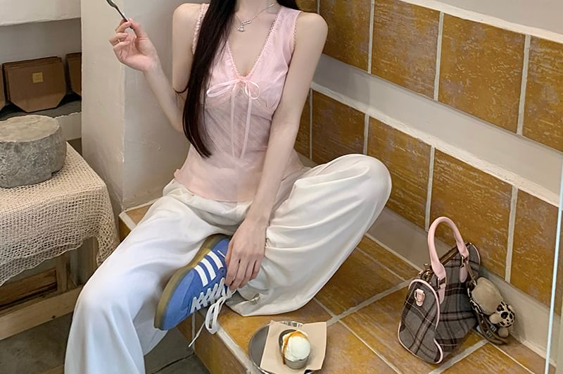 V-Neck Bow Lace Trim Slim Fit Tank Top