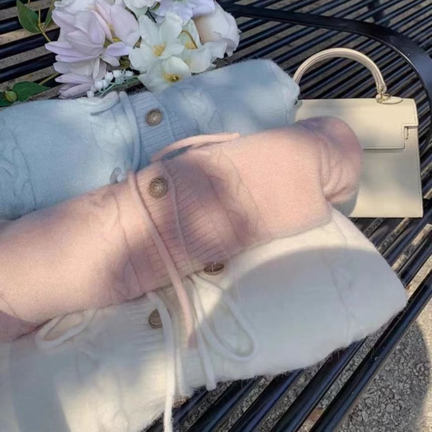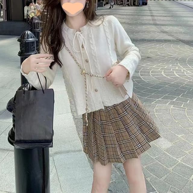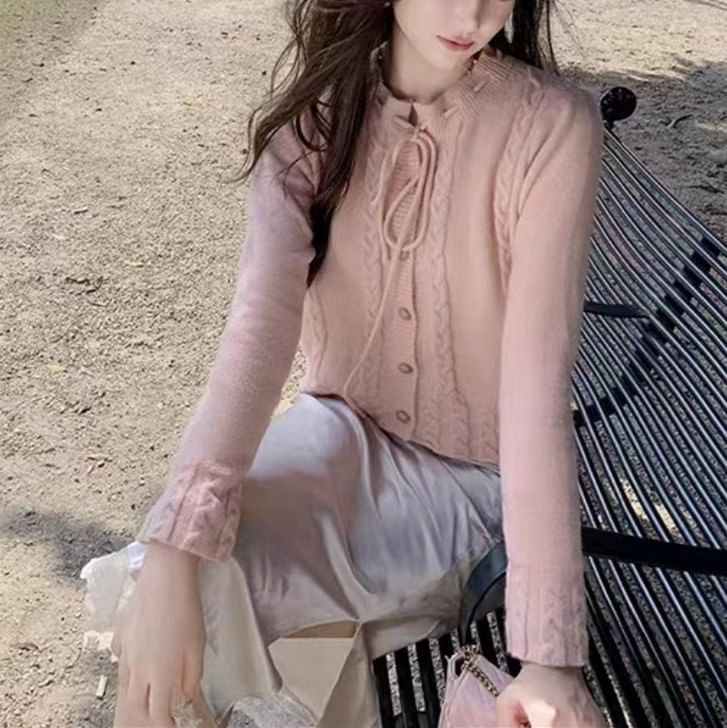 Tie-Neckline Cable-Knit Round-Neck Cardigan