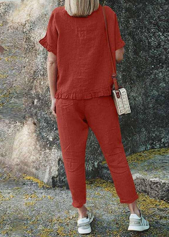 Casual Black Ruffled Patchwork Solid Top And Crop Pants Two Pieces Set Short Sleeve