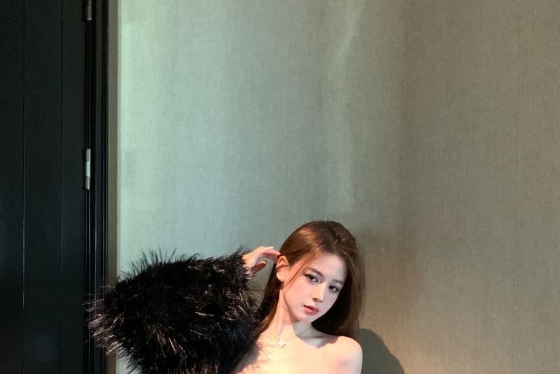 Sequin Faux Leather Panel Mini Bodycon Tube Dress / Plain Fluffy Jacket