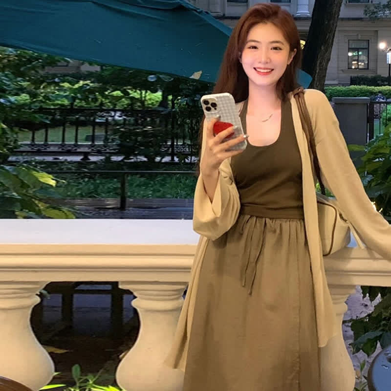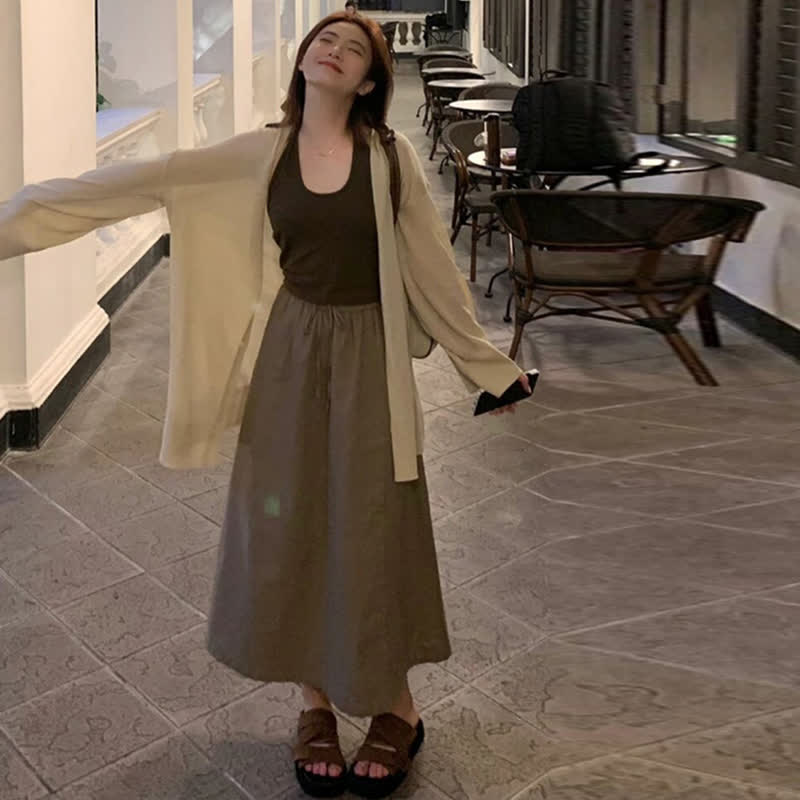V-neck Cardigan Halter Cami Top High Waist Skirt