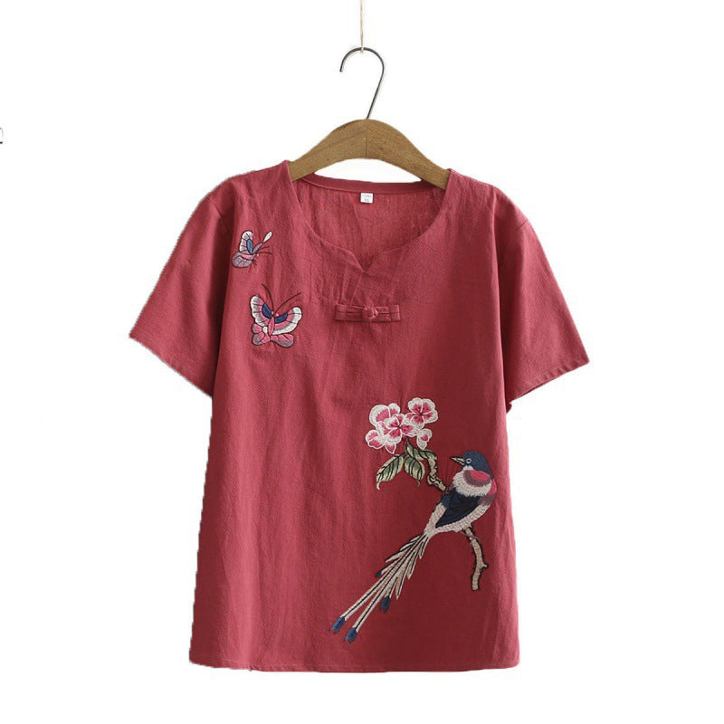 Vintage Bird Embroidery Buckle T-Shirt Pants Set