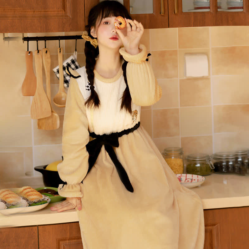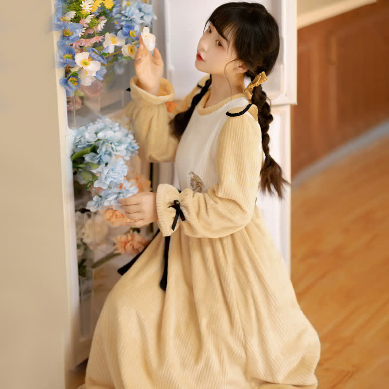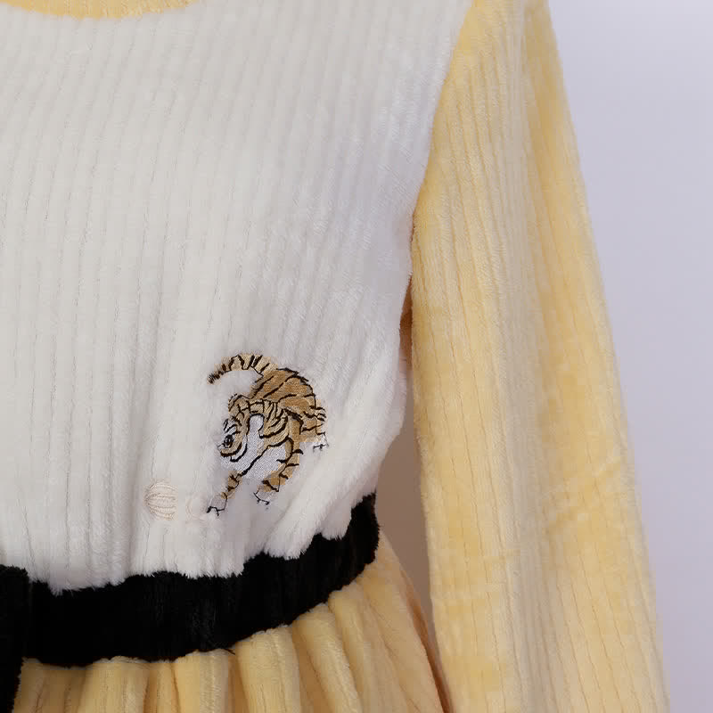 Vintage Tiger Embroidery Bow Knot Plush Dress
