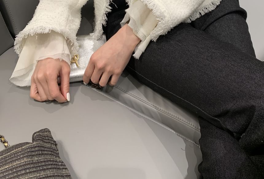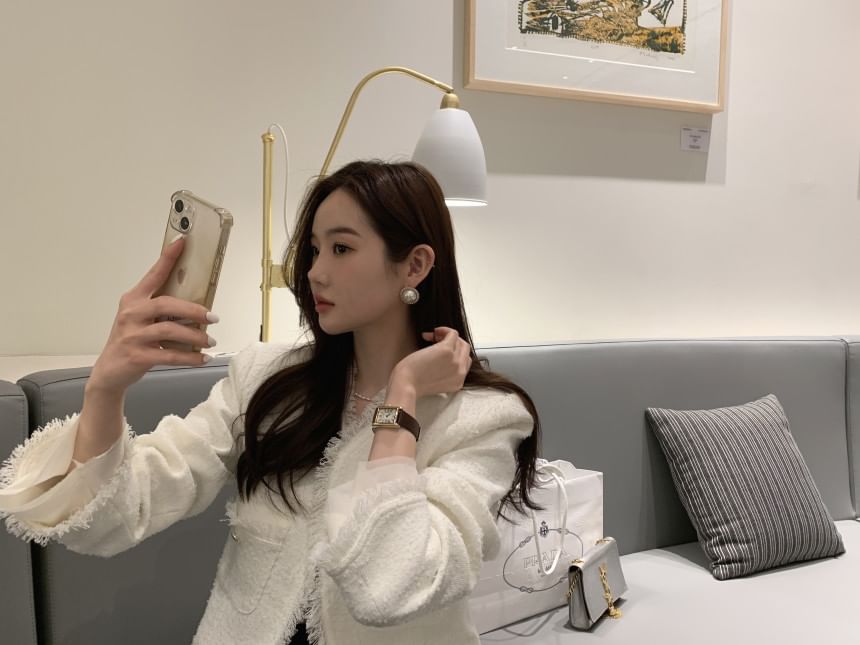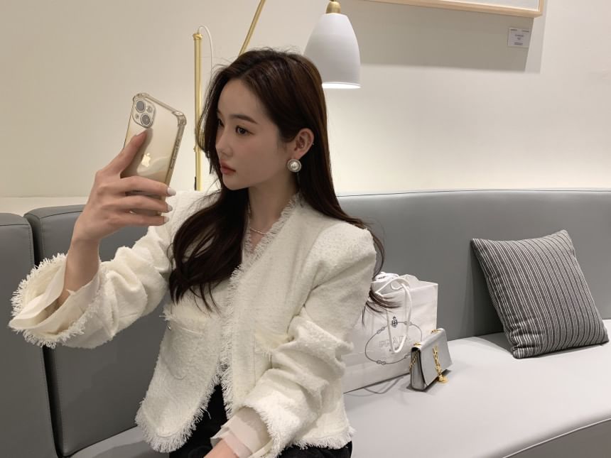 V-Neck Plain Fringe Tweed Jacket