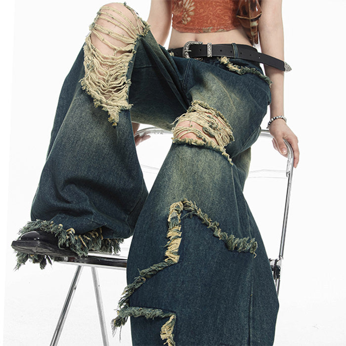Unleash your inner 90's diva with our Y2K Destroyed Jeans. These vintage-inspired jeans feature a distressed look, perfect for a stylish and edgy look. The high-waisted fit and premium denim fabric provide a comfortable and flattering fit. Elevate your denim game with our Y2K Destroyed Jeans.