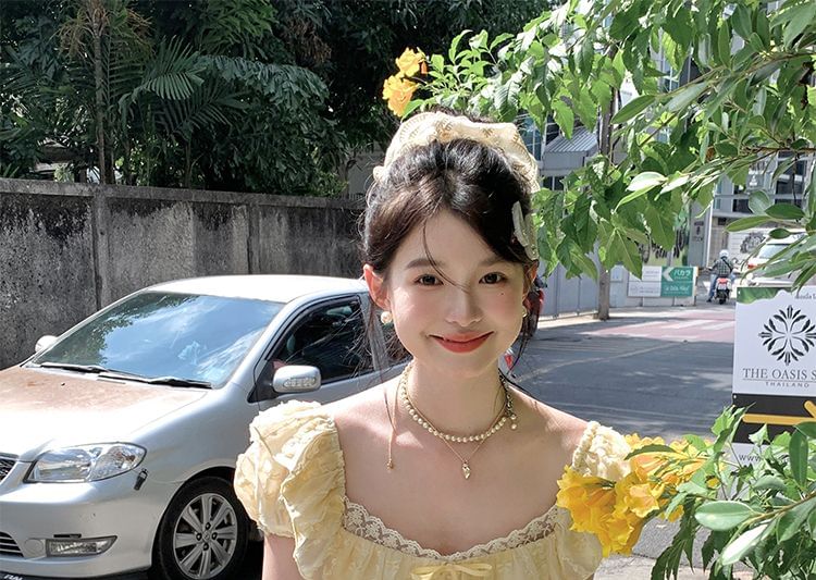 Short Sleeve Square Neck Bow Ruffle Panel Lace Mini A-Line Dress