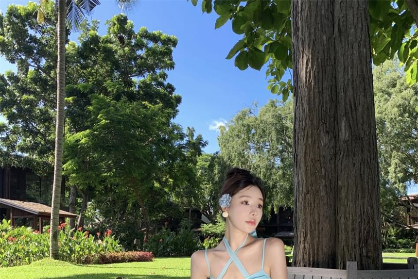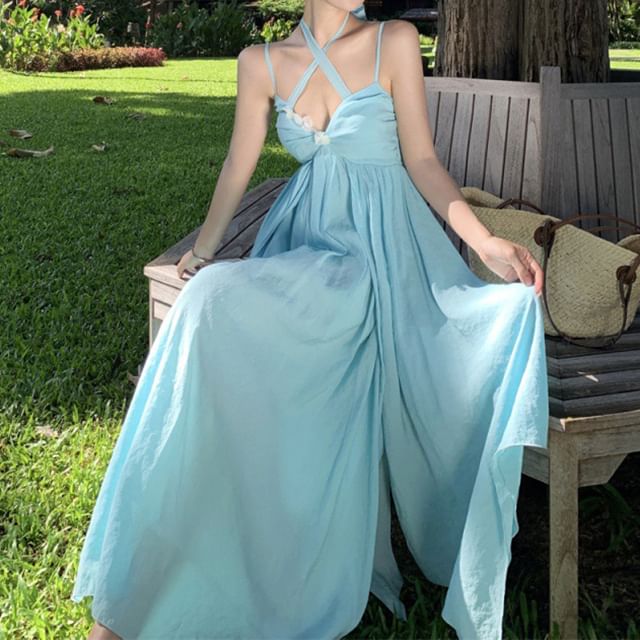 Halter Neck Plain Floral Accent Ruched Layered Open Back Maxi A-Line Dress