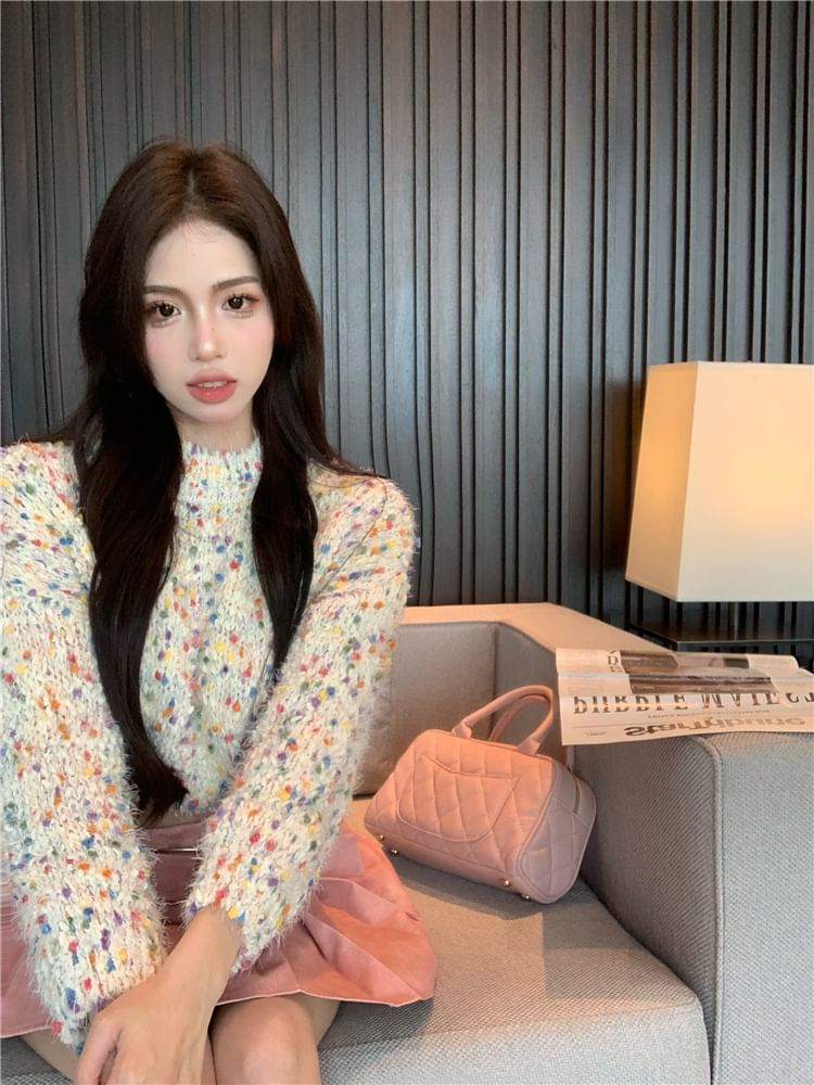 Mock Neck Dotted Cropped Sweater / High Rise Washed Pleated Mini A-Line Skirt