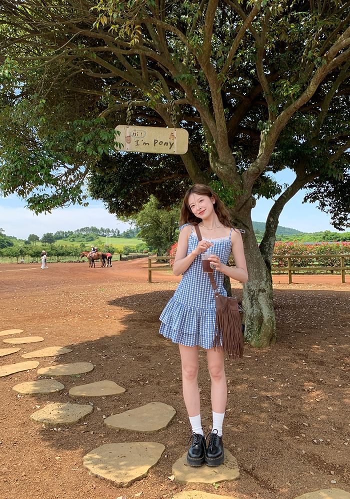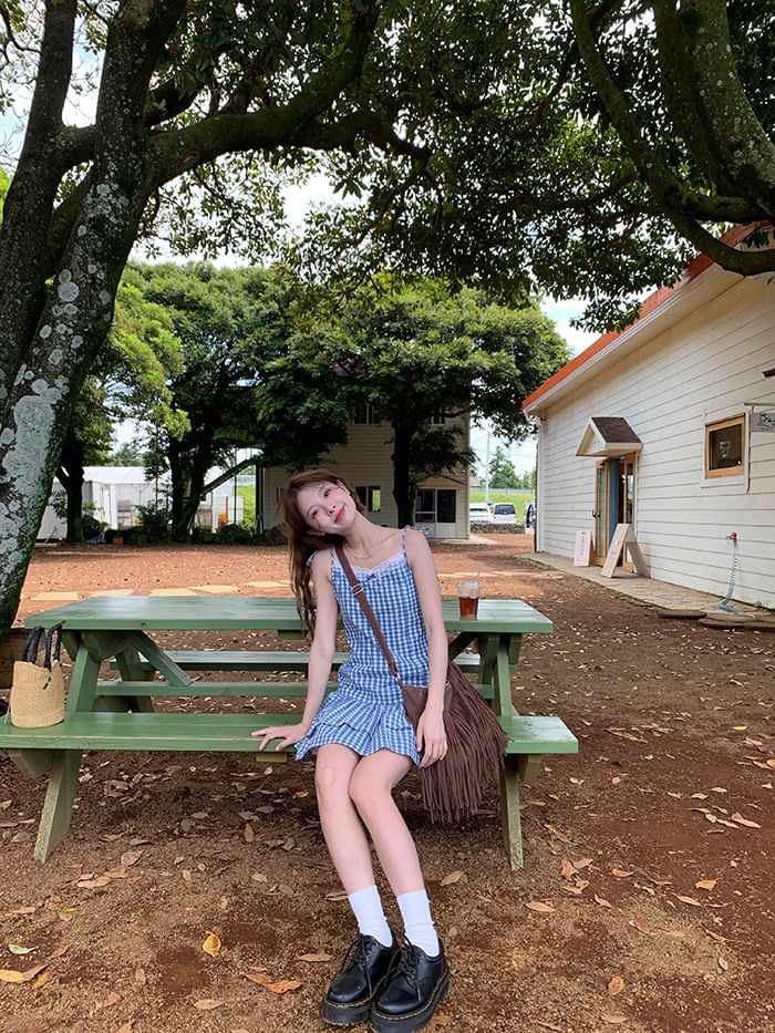 Spaghetti Strap V-Neck Gingham Lace Trim Layered Mini A-Line Dress