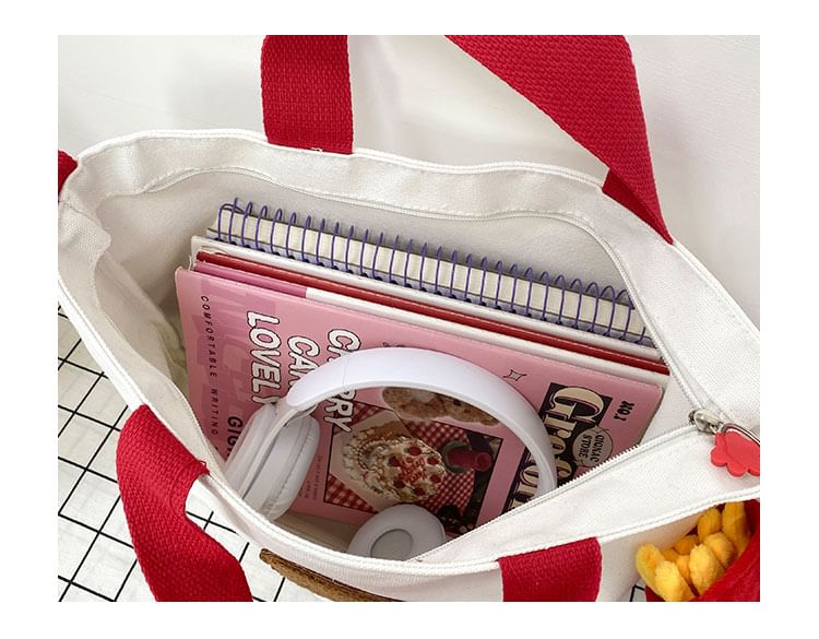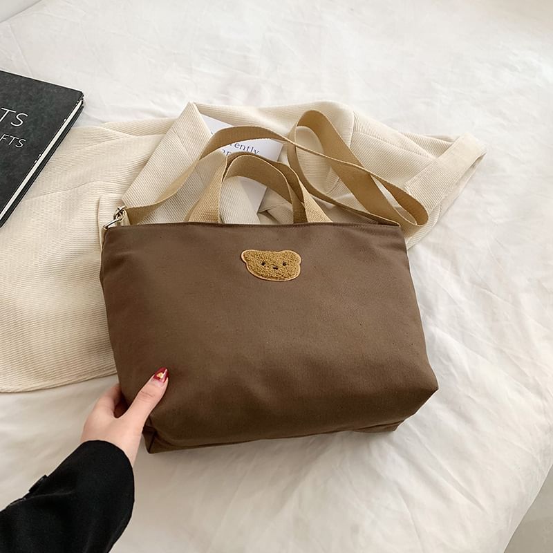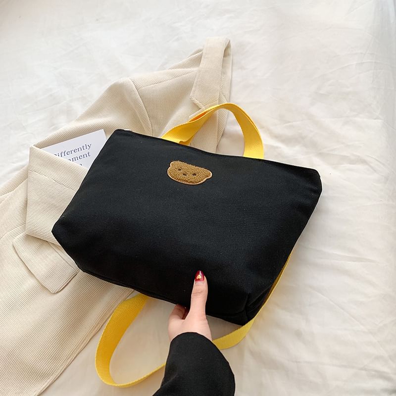 Bear Applique Canvas Color Block Zipper Crossbody Shoulder Bag