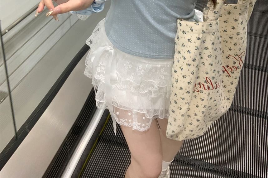 Bear Trim Lace Short-Sleeve Tee Slim Fit Print Crop Neck Scoop