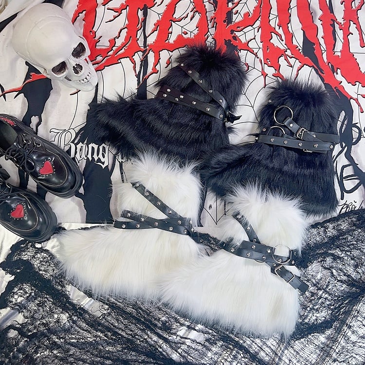 Embrace bold style and cozy warmth with these Black White Studs Strap Shaggy Leg Warmers. Featuring edgy black and white studs and a unique strap design, these leg warmers will add a touch of attitude to any outfit. Keep your legs toasty and your look on point with these stylish leg warmers.