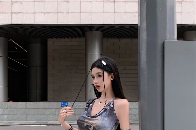 Sleeveless Cowl Neck Butterfly Mini A-Line Print Dress