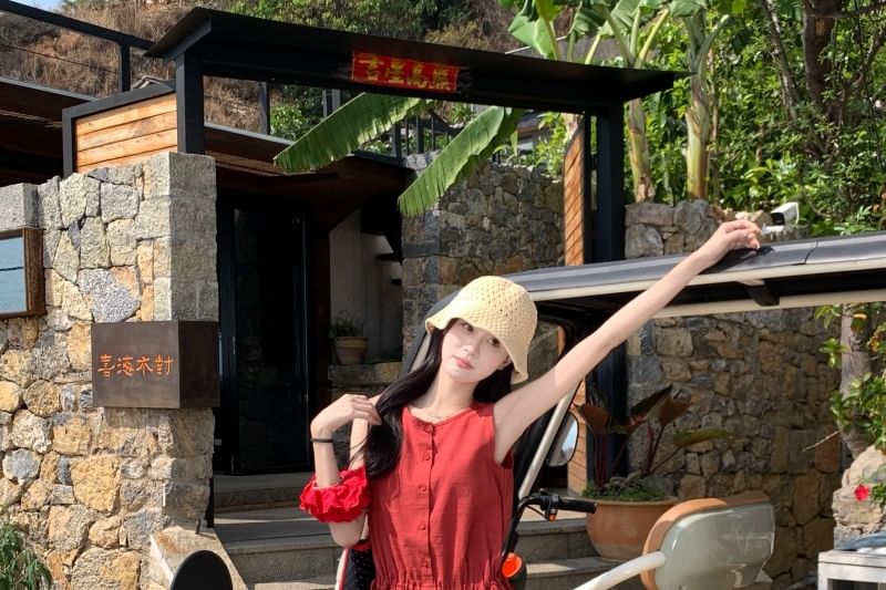 Sleeveless Round Neck Plain Button Mini A-Line Dress