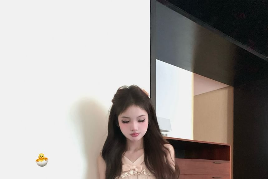 Bowknot Ribbed Knit Cami Top / Ruffle Trim Cardigan / Mid Waist Plain Lace Mini A-Line Skirt